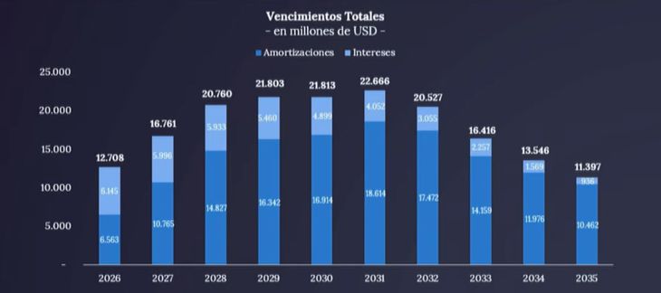 Por otro lado, también valoró la reducción de los intereses de la deuda de 10,2% (promedio 2023) a 1,2% (2025) y exhibió que de los vencimientos por deuda del 2026 (u$s12.708 millones) continuarán en permanente ascenso hasta el 2031 (cuando llega a u$s22.666 millones), proyectándose hasta 2035 hasta los u$s11.397 millones. En ese marco, reconoció que los últimos procesos de reestructuración de deudas por la reciente de incertidumbre electoral.