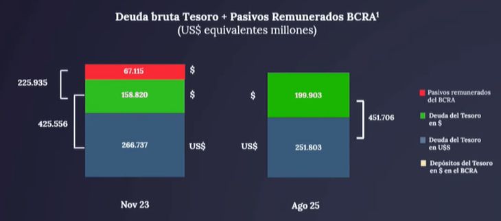 En cuanto a las cuentas públicas, Quirno señaló que en noviembre del 2023 la deuda nacional ascendía a u$s485.563 millones y, para agosto de este año, habría descendido u$s49.019 millones. “La deuda ha estado estirando sus plazos y se ha desindexado considerablemente”, afirmó en simultáneo a la exposición de cifras en donde, a raíz de la absorción de los pasivos remunerados del Banco Central, el endeudamiento del Tesoro pasó de u$s158.820 millones (noviembre del 2023) a u$s199.903 millones (agosto del 2025).