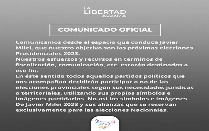 El espacio de Milei explicó que “todos aquellos partidos políticos” que los acompañan “decidirán participar o no de las elecciones provinciales según sus necesidades jurídicas o territoriales, utilizando sus propios símbolos e imágenes partidarios”. “No así los símbolos e imágenes de Javier Milei 2023 y sus alianzas que se reservan exclusivamente para las elecciones Nacionales”, dejó en claro el partido liberal.