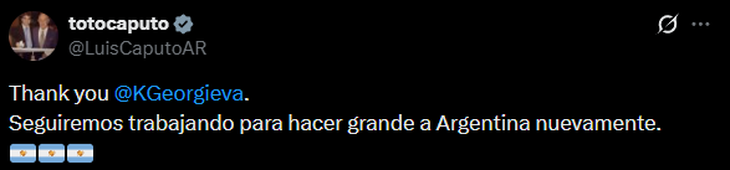 El tuit fue citado por el titular del Palacio de Hacienda, quien aseguró: “Seguiremos trabajando para hacer grande a Argentina nuevamente“.