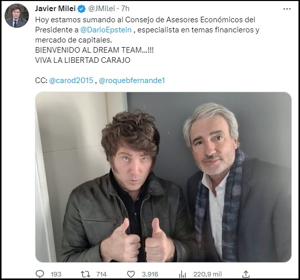 “Hoy estamos sumando al Consejo de Asesores Económicos del Presidente a @DarioEpstein, especialista en temas financieros y mercado de capitales”, anunció el candidato presidencial por La Libertad Avanza. “Bienvenido al dream team!!! Viva la libertad carajo”, agregó.