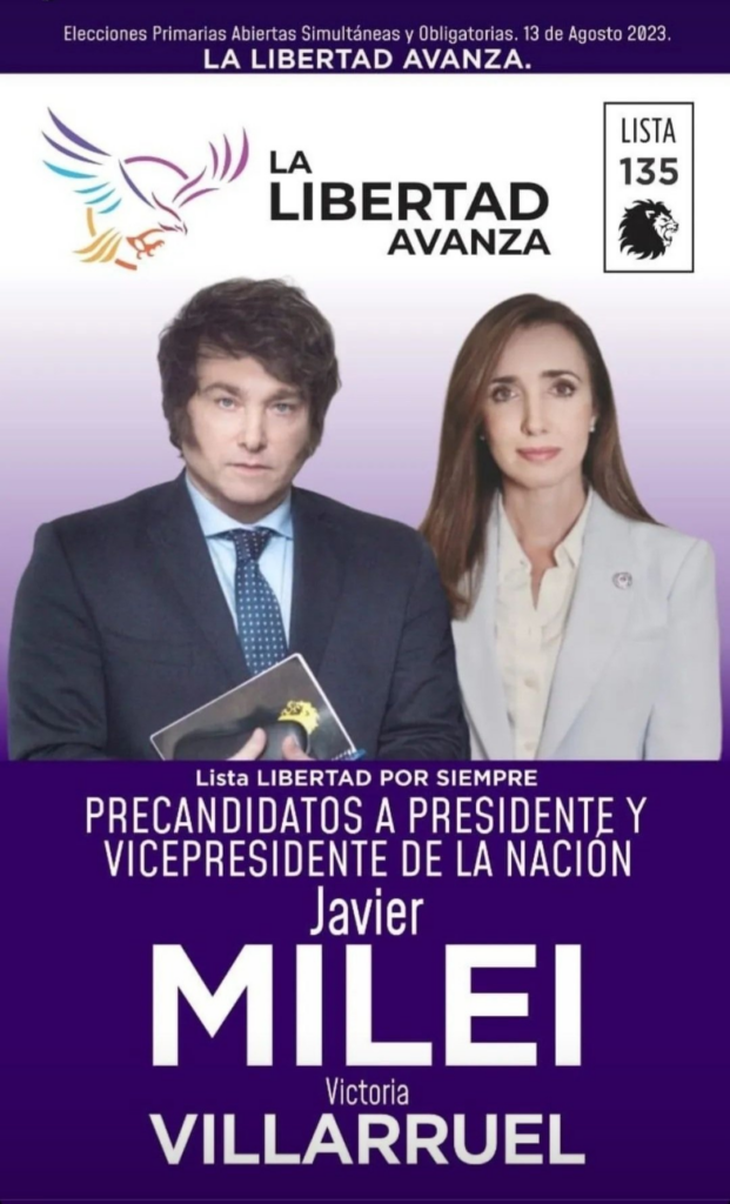 En este contexto y con las candidaturas ya definidas, se conoció la hoja principal de la boleta de La Libertad Avanza, donde se puede ver a la fórmula presidencial integrada por Javier Milei y Victoria Villarruel, pertenecientes a la lista 135. La fórmula se presenta bajo el nombre “LIBERTAD POR SIEMPRE”.