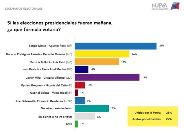 De acuerdo a la muestra tomada entre el 14 y el 21 de julio sobre 1780 casos, la sumatoria en intención de votos para Juntos por el Cambio supera a la de Unión por la Patria por apenas un punto, 29 a 28 por ciento, respectivamente. Entre tanto, la propuesta de La Libertad Avanza, con Javier Mieli, obtiene el 19 por ciento.
